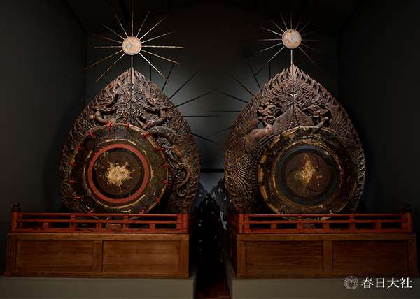 春日大社には、祭礼に舞われる芸能が伝承されると共に、その面や装束、楽器が伝承しています。中心は舞楽に関するもので、舞楽面は、重要文化財12点を含む、平安時代・近代に至る19種80点が、舞楽装束は桃山・江戸時代の約500点が伝えられています。また国宝の鼉太鼓をはじめ鎌倉・江戸時代の雅楽器約60点が伝来します。舞楽は5・6世紀に大陸より渡来した各種の楽舞が平安時代に整備され、国風化して定着した伝統芸能で、宮廷や社寺の儀式祭典に演奏されました。