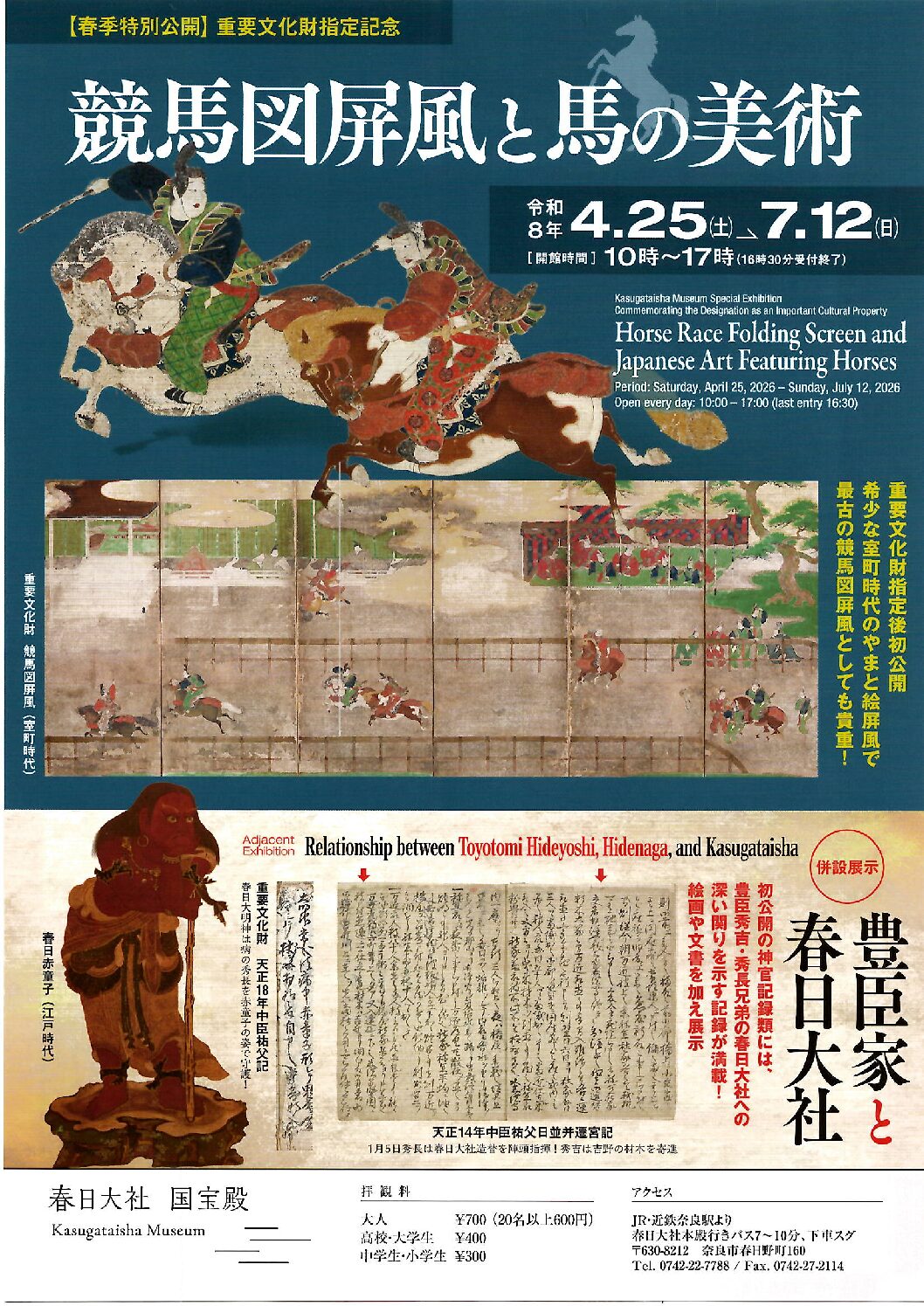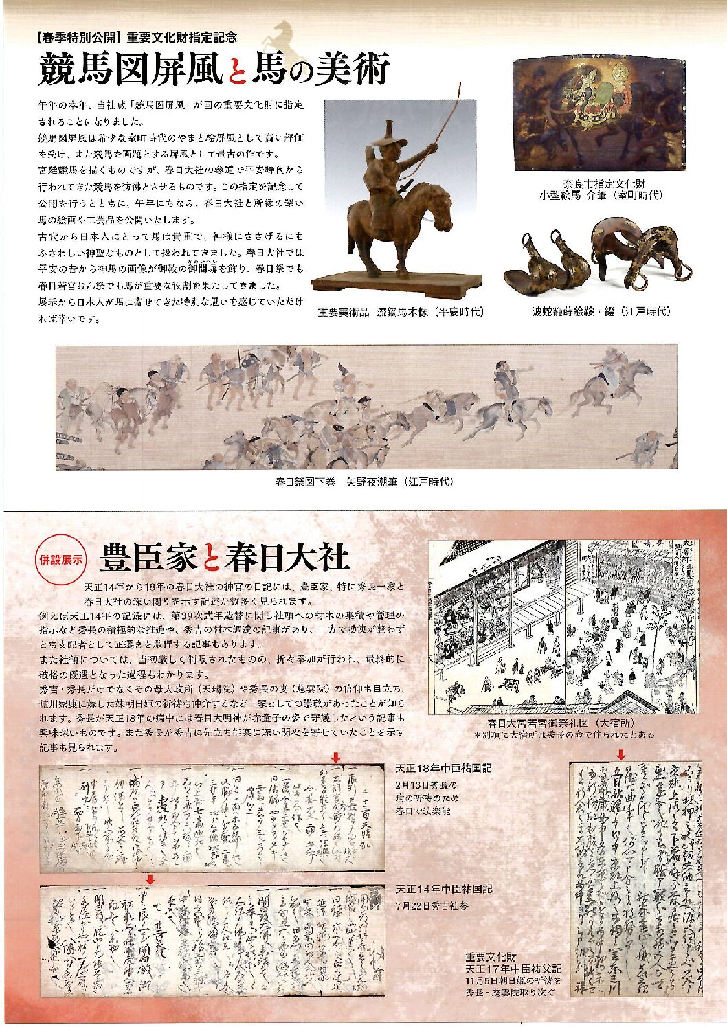 宮廷競馬を描くものですが、春日大社の参道で平安時代から行われてきた競馬を彷彿とさせるものです。指定を記念して公開を行うとともに、午年にちなみ、春日大社と所縁の深い馬の絵画や工芸品を公開いたします。