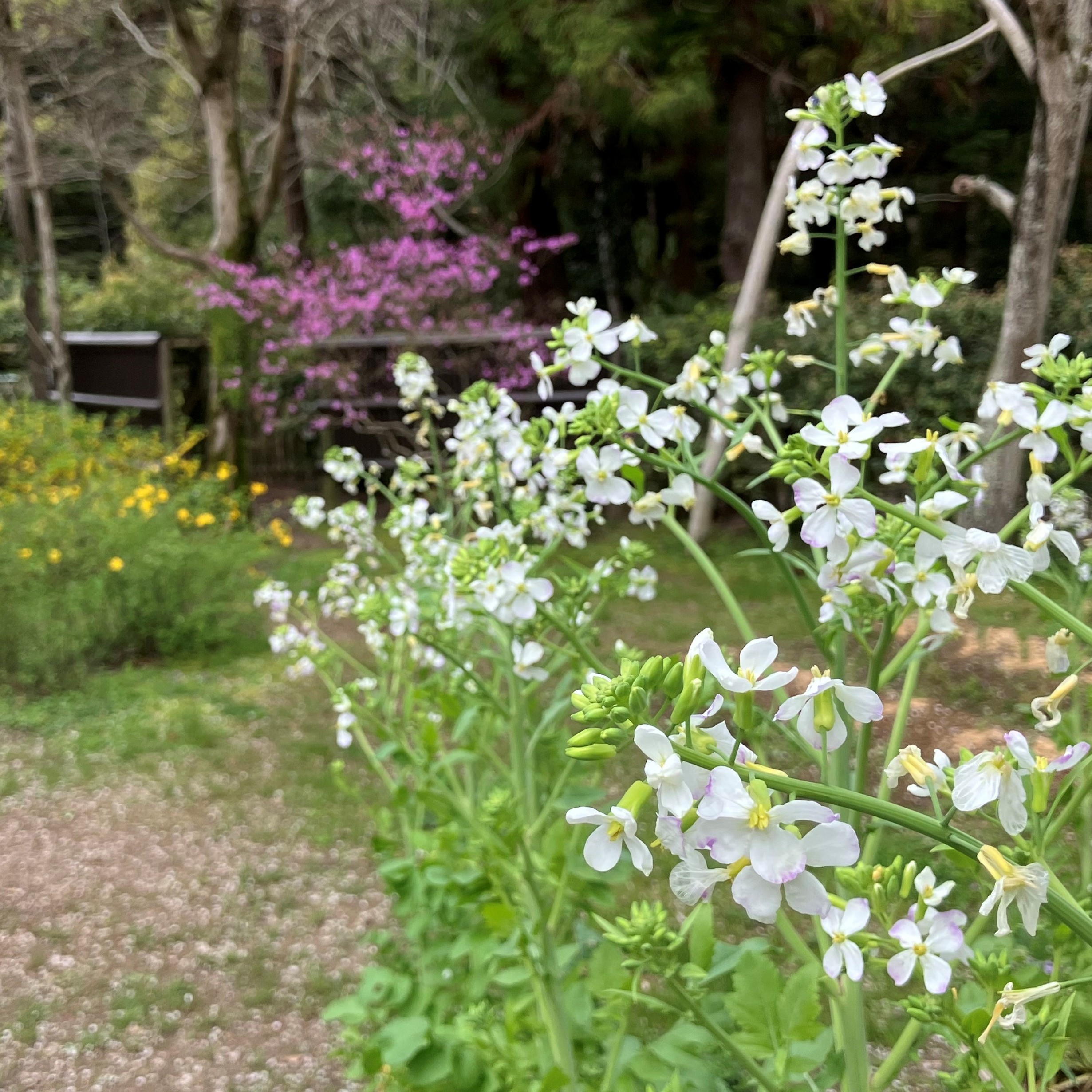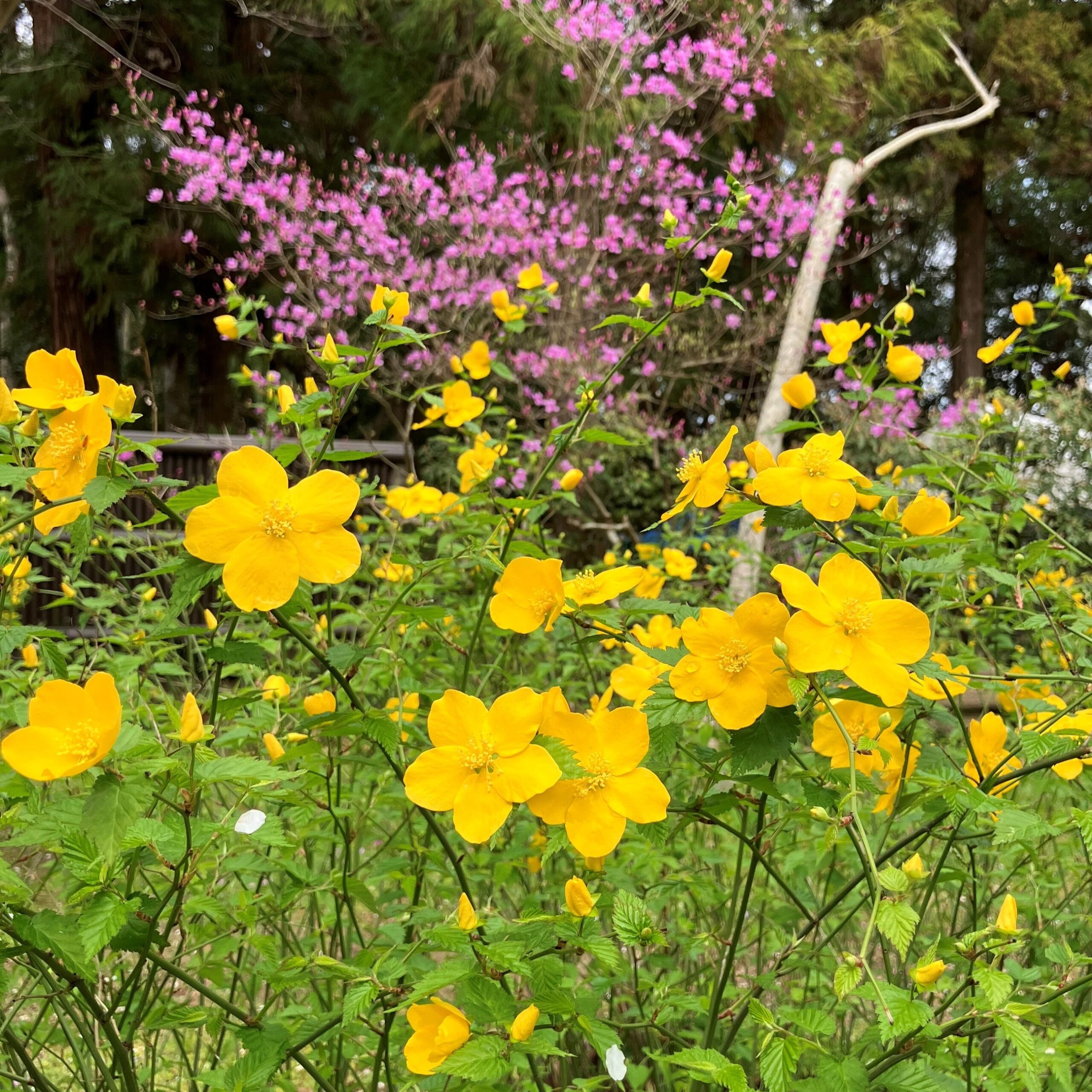 ヤマブキやミツバツツジなど色鮮やかな草花が園内各所で咲いています。